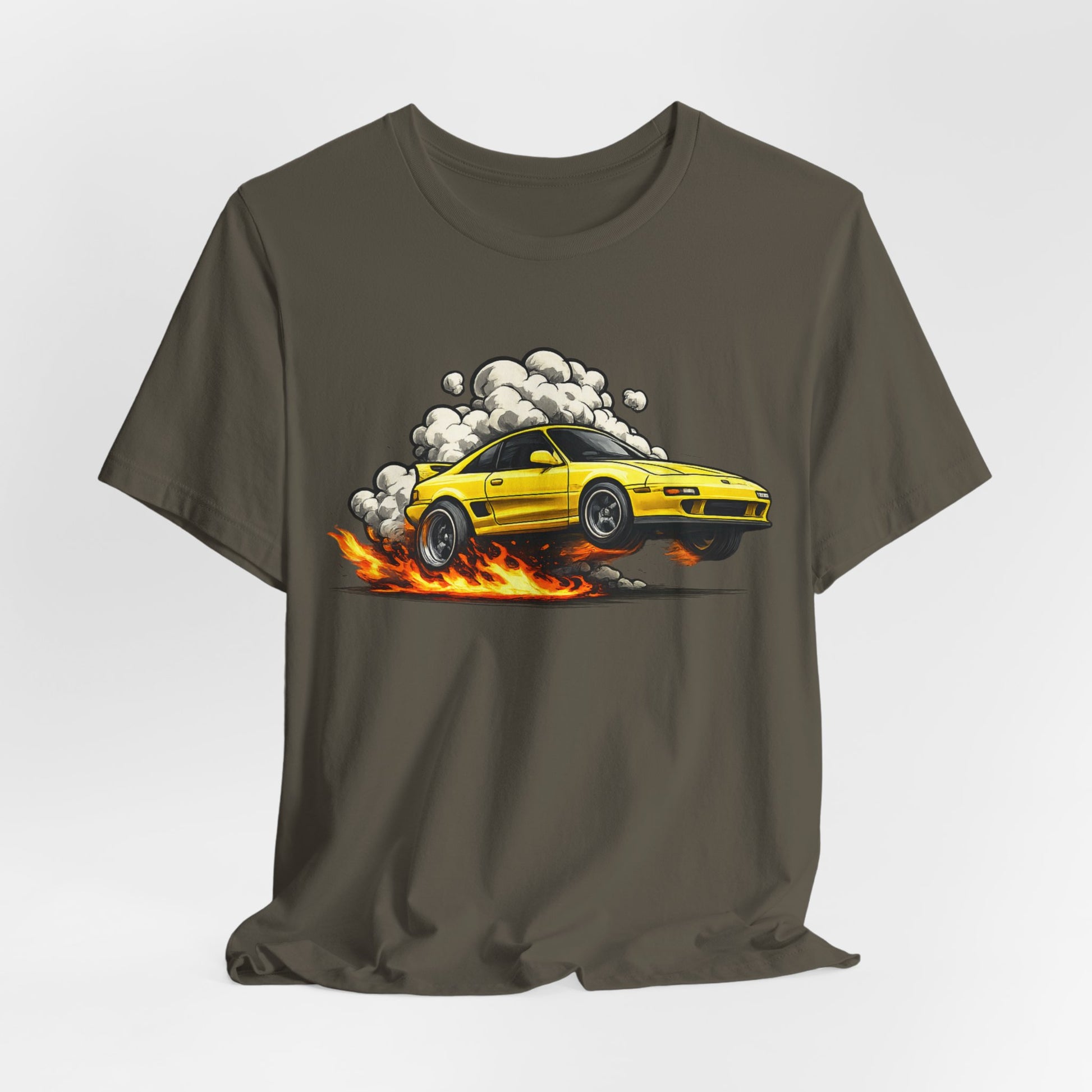 Mid-engine chaos at full send. This yellow SW20 MR2 is doing what MR2s do best: roasting fat rear tyres, making smoke, and pretending grip is optional. Wear it if you enjoy boost, bad decisions, and mid-engine confidence.